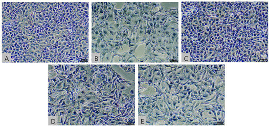 Micrograph after HE staining of control cells (100×) (A); micrograph after HE staining of 30,000-nMAFB1-treated cells (100×) (B); micrograph after HE staining of 1.2-nM T-2-treated cells (100×) (C); micrograph after HE staining of 30,000-nM AFB1- and 1.2-nM T-2-treated cells (100×) (D); micrograph after HE staining of 23,272-nM AFB1- and 1-nM T-2-treated cells (100×) (E).