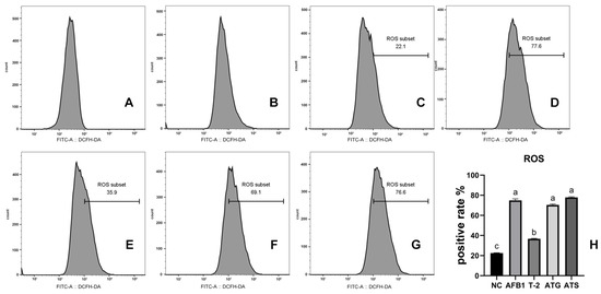 ROS production in T-2/AFB1-treated or untreated PK15 cells for 24 h. There are seven groups (A–G): negative control (A); positive control (B); cells were untreated (C); cell treated with AFB1 (D); cell treated with T-2 (E); cell treated with estimated IC50 of combined toxins (F); cell treated with observed IC50 of combined toxins (G); histogram of ROS positive rate in different groups (H). Values with the difference superscripts (a–c) are significant differences (p < 0.05). ATG means estimated IC50 group, ATS means observed IC50 group.
