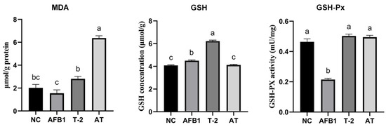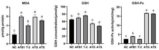 In terms of GSH levels, the T-2 group showed a significant increase compared to the NC group (p < 0.05), while the ATG and ATS groups exhibited a significant decrease in GSH levels (p < 0.05). Conversely, the AFB1 group showed no significant difference in GSH levels compared to the NC group (p > 0.05).