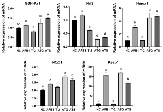 The results indicated that the relative expression of Nrf2 was significantly elevated in the AFB1 group compared to the NC group (p < 0.05), while the relative expression of Nrf2 was significantly decreased in the T-2, ATG, and ATS groups (p < 0.05). There were no significant differences in Nrf2 relative expression levels between the ATG and ATS groups (p > 0.05).