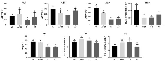 Changes of ALT, AST, ALP, BUN, TP, TC, and TG in T-2/AFB1-treated or untreated mice. Values with the difference superscripts (a–c) are significant differences (p < 0.05). AT means combined group.