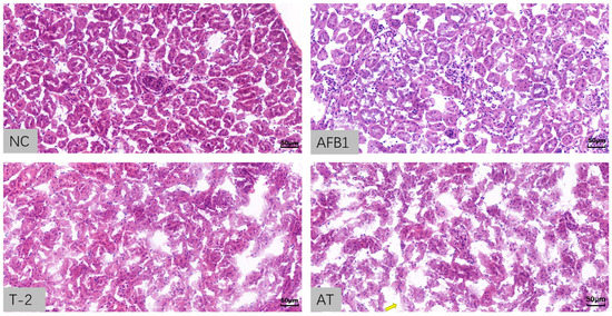The histopathological analysis of the kidneys was performed using HE staining of paraffin sections, and the results are presented in Figure 8. The glomeruli and tubules in the NC group showed normal morphology and no pathological issues. The tissue structure and morphology of the AFB1 group were similar to those of the NC group. However, the T-2 and AT groups exhibited glomerular atrophy, interstitial edema, dilated tubules, and blurred tubular structures with inflammatory cell infiltration.