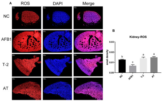 The ROS assay was performed in kidney tissue and the results are presented in Figure 9. In the kidney tissue, the level of ROS was markedly reduced in the AFB1 group compared to the NC group (p < 0.05), while the level of ROS was significantly elevated in the T-2 and AT groups (p > 0.05).