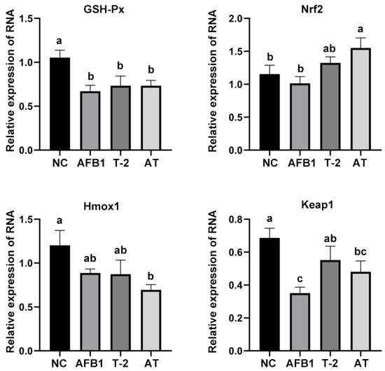 The relative expression of GSH-Px, Nrf2, Hmox1, and Keap1 mRNA in T-2/AFB1-treated or untreated kidney tissue of mice. Values with the difference superscripts (a–c) are significant differences (p < 0.05). AT means combined group.