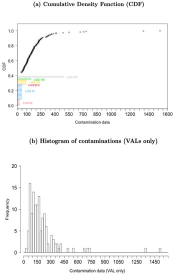 - Shoari, N.; Dubé, J.S. Estimating the mean and standard deviation of environmental data with below detection limit observations: Considering highly skewed data and model misspecification. Chemosphere 2015, 138, 599–608. [Google Scholar] [CrossRef] [PubMed]