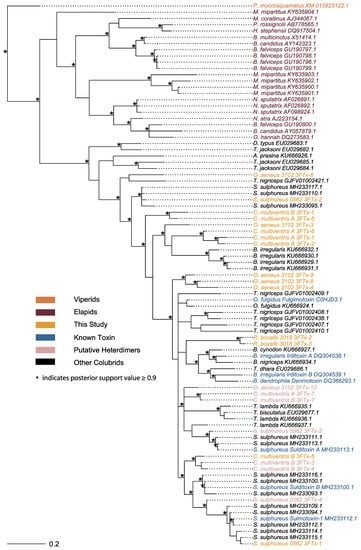 - Dashevsky, D.; Debono, J.; Rokyta, D.; Nouwens, A.; Josh, P.; Fry, B.G. Three-Finger Toxin Diversification in the Venoms of Cat-Eye Snakes (Colubridae: Boiga). J. Mol. Evol. 2018, 86, 531–545. [Google Scholar] [CrossRef] [PubMed]
