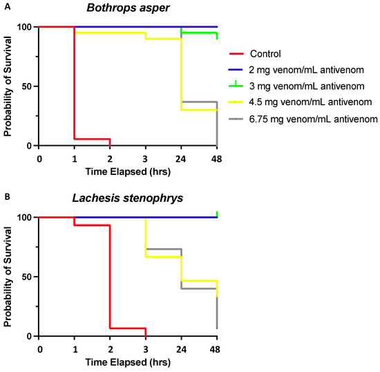 Kaplan–Meier survival analysis of (A) B. asper and (B) L. stenophrys venoms stratified into five groups (controls and 2, 3, 4.5, and 6.75 mg venom/mL antivenom) shows a significantly better overall survival for groups receiving lower venom/antivenom dosages. Lethality rates were not different between venoms.