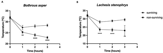 Temperature differences between surviving and non-surviving mice. Groups of five mice were inoculated with mixtures of a fixed dose of B. asper (A) or L. stenophrys (B) venoms (4xLD50) and variable doses of antivenom (2, 3, 4.5, and 6.75 mg venom/mL antivenom). Body temperature was recorded before inoculation and every hour for 3 h. Graphs represent mean ± 95% CI of temperature from surviving (n = 40 for B. asper; n = 39 for L. stenophrys) and non-surviving (n = 35 for B. asper; n = 35 for L. stenophrys) mice. Animals that did not survive had significantly lower temperatures at all time points (except at 0 h) relative to animals that survived, (** p < 0.01; **** p < 0.0001).