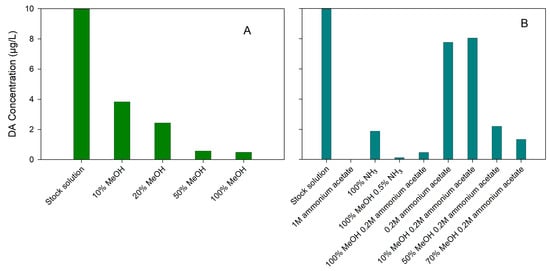 Elution solvents tested in SPE extraction of domoic acid: (A) study of methanol percentage; (B) study of basic solutions.