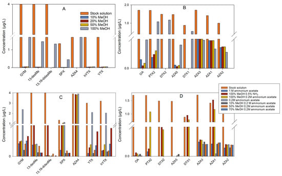 The percentage of MeOH was optimized from 10 to 100, with the recovery of DA decreasing (Figure 1A) and that of lipophilic toxins increasing (Figure 2A,B).