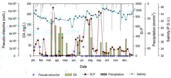 The overlapping of the silicates to phosphate molar ratio (Si:P), which is an expression of phosphorous limitation against silicates used by diatoms to form its valves, suggests a positive correlation between Si:P and DA, although more data are required to confirm this hypothesis in our system. Furthermore, the life cycle for Pseudo-nitzschia can last from 2–3 days to several weeks [57,58], while the toxin can remain stable in the water for several weeks to a few months [59]. Moreover, not all Pseudo-nitzschia species produce the same amount of toxin, and they do not do so under the same exact environmental conditions.