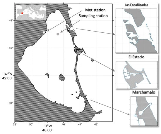 Locations of the Mar Menor coastal lagoon, sampling station, and meteorological station with detail of the three inlets connecting the Mar Menor coastal lagoon with the Mediterranean Sea. The cross-sectional area of the Las Encañizadas inlet is 40% of the total cross-sectional area of the lagoon, which has a heavy influence on the water exchange at the sampling point.