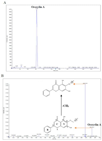 In the past, we merely performed the tentative identification of Oroxylin A in PSE through the mzCloud database (https://www.mzcloud.org, accessed on 30 May 2021) []. Therefore, in the present study, UPLC-QTOF-MS was used for further qualitative and quantitative validation of Oroxylin A in PSE based on the MS and MS2 fragmentation patterns of an Oroxylin A reference standard in order to enable the determination of the suitable dosages of Oroxylin A for subsequent experiments. In addition, the antifungal and anti-mycotoxin properties of Oroxylin A against F. graminearum were assessed.