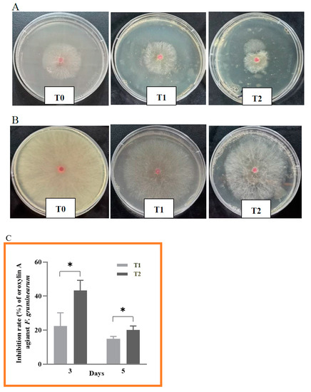Oroxylin A contents of 64 and 128 ng/mL both inhibited the growth of F. graminearum on agar plates 3 and 5 days after inoculation (Figure 2A,B), and the inhibition was quantified (Figure 2C). An Oroxylin A content of 64 ng/mL (T1) inhibited growth by 22.4 and 15.0% after 3 and 5 days of incubation, respectively, and 128 ng/mL (T2) of Oroxylin A inhibited growth by 43.4 and 20.1% after 3 and 5 days, respectively. The T2 inhibition was higher than that of T1 (p < 0.05).