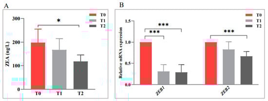 Zearalenone (ZEA) is a mycotoxin that is mainly produced by Fusarium species, including F. graminearum, which is found to contaminate a wide range of foods and feeds [,]. ZEA has a high thermal stability, so it is difficult to degrade during the processing, storage, or handling of foods and feeds, constituting a considerable threat to human and animal health [,]. After ingestion, ZEA and its reduced metabolites can bind to and activate estrogen receptors because of their structural similarity to estrogens, which, in turn, causes reproductive dysfunction in female animals such as abortion and false estrus, as well as immunotoxicity and advanced puberty [].