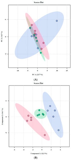 Multivariate statistical analyses, including principal component analysis (PCA) and supervised partial least-squares discriminant analysis (PLS-DA) of the metabolic dataset, were performed using MetaboAnalyst 5.0 (http://www.metaboanalyst.ca/, assessed on 6 April 2023). Furthermore, the value of the fold change (FC) was calculated as the average normalized peak intensity ratio between samples. Differences between datasets with FC > 1.10 or FC < 0.90 and p < 0.05 (via Student’s t-test) were considered statistically significant.