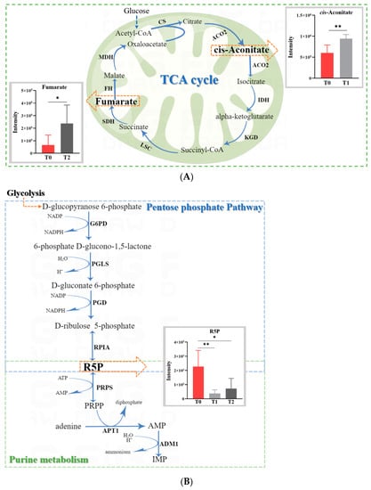 Common pathway analysis generated by MetaboAnalyst 5.0, based on differential metabolites from both T0 vs. T1 and T0 vs. T2. (A) TCA cycle; (B) pentose phosphate and purine metabolism pathways. For details in figures, refer to the SGD (http://pathway.yeastgenome.org/, assessed on 6 April 2023) and KEGG (http://www.genome.jp/kegg/, assessed on 6 April 2023) databases. Abbreviations: ACO2: aconitase; ADMI: adenosine 5-monophosphate deaminase; AMP: adenosine monophosphate; APTI: adenine phosphoribosyltransferase; CS: citrate synthase; FH: fumarate hydratase; G6PD: glucose-6-phosphate dehydrogenase; IDH: isocitrate dehydrogenase; IMP: inosine monophosphate; KGD: 2-ketoglutarate–dehydrogenase complex; LSC: succinyl-CoA ligase; MDH: malate dehydrogenase; PGD: 6-phosphogluconate dehydrogenase; PGLS: 6-phosphogluconolactonase; PRPP: 5-phospho-alpha-D-ribose 1-diphosphate; PRPS: ribose-phosphate pyrophosphokinase; RPLA: ribose 5-phosphate isomerase A; SDH: succinate dehydrogenase. All data are expressed as the mean ± SEM. Significance: * p < 0.05 and ** p < 0.01. Red color in figure means the differential metabolites.