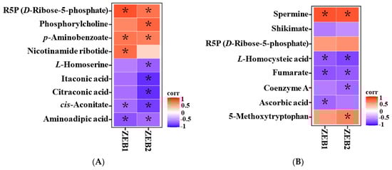Pearson’s correlation analysis (Figure 6) showed significant correlations between most of the differential metabolites and the ZEB1 and/or ZEB2 mRNA levels. Seven metabolites correlated with both ZEB1 and ZEB2 (p < 0.05), namely aminoadipic acid, cis-aconitate, p-aminobenzoate, and R5P in T1 (Figure 6A), and spermine, fumarate, and L-homocysteic acid in T2 (Figure 6B).