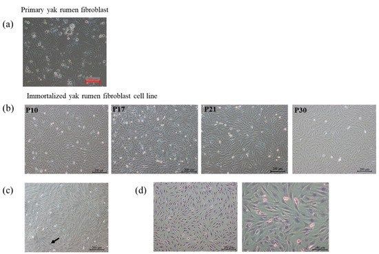 Morphology of primary yak rumen fibroblasts and establishment of fibroblast cell lines. (a) Primary cells (×100). (b) Cell morphology of yak rumen fibroblast cell lines with different generations of passage (×100). (c) Cellular senescence SA-β-gal staining (×100). (d) Hematoxylin–eosin (HE) staining (×100, ×200).