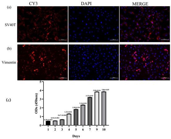 Primary yak rumen fibroblasts were infected with lentivirus expressing SV40 large T antigen, which was produced by co-transfecting lentiviral vector (pGMLV-SV40T-PURO) and packaging vectors. The presence of the SV40 large T antigen was validated by immunofluorescence analyses. The results showed that cells expressed SV40 large T antigen (Figure 2a). Vimentin is an intermediate filament that can indicate the mesenchymal origin of fibroblast cells. We used vimentin as a dermal fibroblast marker and found strong immunoreactivity of yak rumen fibroblast cells to vimentin (Figure 2b). Cell proliferation was assessed using the CCK8 assay, and the growth curve was depicted in Figure 2c. The growth curve exhibited a characteristic “S” shape, indicating that the cells underwent incubation, logarithmic growth, and plateau stages, in accordance with the typical growth pattern of cells. These results indicated that the established yak rumen fibroblast lines were consistent with the morphological characteristics and proliferation capacity of normal fibroblasts.