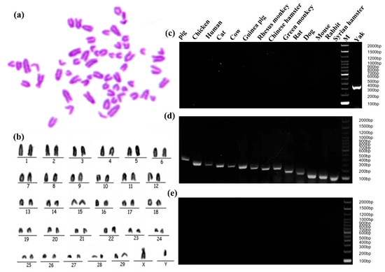 Genetic characteristic analysis of immortalized yak rumen fibroblast cell lines. (a) Karyotype analysis of yak rumen fibroblast cell line (SV40T-YFB). (b) Chromosomal rearrangements of SV40T-YFB. (c) PCR product of SV40T-YFB. (d) PCR products from 14 common cell species (pig, chicken, human, cat, cow, guinea pig, rhesus monkey, Chinese hamster, green monkey, rat, dog, mouse, rabbit, Syrian hamster). Positive control, template is species DNA. (e) The PCR results of 14 species-specific fragments (negative control, the template is sterile ultrapure water).
