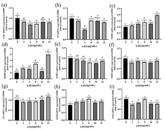 Effects of LPS on the expression of ECM-degradation-related genes in yak rumen fibroblasts (SV40T-YFB). SV40T-YFB cells were cultured without stimulation and treated with various concentrations of LPS (2, 4, 8, 16, and 32 μg/mL) for 24 h. Subsequently, the mRNA levels of COL Ι (a), FN (b), MMP-2 (c), MMP-9 (d), TIMP-1 (e), TIMP-2 (f), uPA (g), uPAR (h), and PAI-2 (i) were determined using quantitative polymerase chain reaction (qPCR) (n = 3). Data are expressed with one-way ANOVA as means ± SEM. The letters above the bars indicate statistically significant groups. Different letters indicate significantly different values among treatments at p < 0.05. Columns with the same letter indicate lines that were not different (p > 0.05).