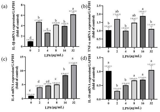Effects of LPS on the expression of inflammatory-response-related genes in yak rumen fibroblasts (SV40T-YFB). SV40T-YFB cells were cultured under unstimulated conditions and the LPS at 2, 4, 8, 16, and 32 μg/mL were treated for 24 h. After treatments, the IL-1β (a), TNF-α (b), IL-6 (c), and IL-10 (d) mRNA levels were determined by qPCR, respectively (n = 3). Data are expressed with one-way ANOVA as means ± SEM. The letters above the bars indicate statistically significant groups. Different letters indicate significantly different values among treatments at p < 0.05. Columns with the same letter indicate lines that were not different (p > 0.05).