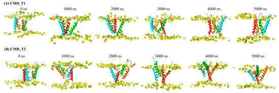 2.1. Structural and Positional Changes of Tetrameric AapA1-28 Protein Elucidated through CMD_T1/2 Simulations