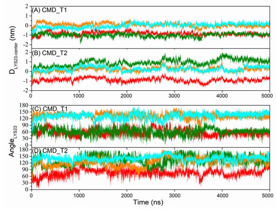PWR and NMR studies on AapA1 protein have indicated that the protein adopts a vertical transmembrane state [4]. The C-terminal charged residues play a critical role in the protein’s toxicity, as their removal reduces its membrane-destructive ability. However, the underlying reasons for this effect remain unclear. Snapshots of the tetrameric AapA1-28 protein–membrane structure at different time points are displayed in Figure 1. Simulation details are shown in Table 1. In the initial conformation, the angle between the protein’s helical axis and the bilayer normal is less than 10°. The distance between the C-terminal five residues 24–28 (VVVLL) and the center of membrane is approximately −1 nm. K-11 and K-16 residues interact with the upper membrane, while K-23 residues interact with the bottom membrane. However, this initial transmembrane state is not entirely stable for a portion of the AapA1-28 protein. Three significant changes occur in the AapA1-28 protein: the angle between the protein’s helical axis and the bilayer normal increases (as shown in Figure S1C,D), the distance between C-terminal five residues 24–28 (VVVLL) and the membrane center decreases (as shown in Figure S1A,B), and the angle between K-23 side chain and membrane Z-axis (as shown in Figure 2) increases. K-23 side chain changes from a downward orientation to an upward orientation, interacting with the upper membrane.