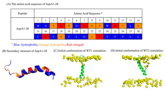 We performed two sets of 5000 ns CMD simulations of the AapA1-28 tetramer-containing membrane systems (simulation details shown in Table 1). Each simulation contained four AapA1-28 proteins (sequence: MATKHGKNSWKTLYLKISFLGCKVVVLL, the sequence and structure characteristic of AapA1-28 are shown in Figure 3A,B). The initial conformations of the AapA1-28 monomer protein–membrane systems were derived by referring PWR and NMR experiments of full-length monomer AapA1 protein [4]. The AapA1-28 monomer protein was set as vertical transmembrane states and Ser9-Leu28 residues were set as a transmembrane region with an alpha-helix. Two sets of initial configurations of these tetrameric AapA1-28 protein–membrane systems were constructed (shown in Figure 1A,B). In the first conformation (Figure 1A), the protein tetramerized into a face-to-face tetramer, and four K-23 residue side chains faced the channel pore. In the second conformation (Figure 1B), the protein tetramerized into a face-to-back tetramer, and two K-23 residue side chains faced the bilayer.