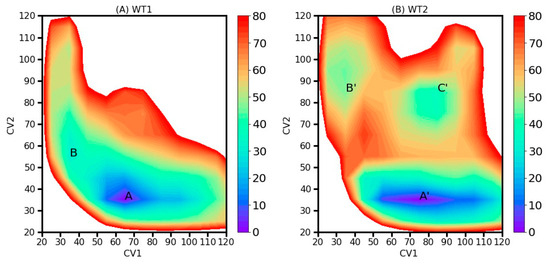 Two-dimensional free energy landscapes depicting the relationship between CV1 and CV2 for (A) WT1 and (B) WT2. The labeled local minima are denoted as A, B, A’, B’, and C’. The global minimum is assigned a free energy value of zero.