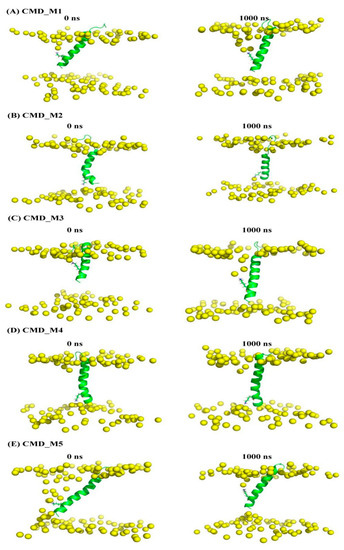 We conducted five sets of 1000 ns CMD simulations for membrane systems incorporating monomeric AapA1-28. These simulations were initiated from the local energy minimum state obtained from the 2D-MetaD simulations, as described in Table 1. The simulation parameters remained the same as previously stated. All simulated systems were equilibrated for 800 ns, and subsequent 200 ns simulations were used for analysis.