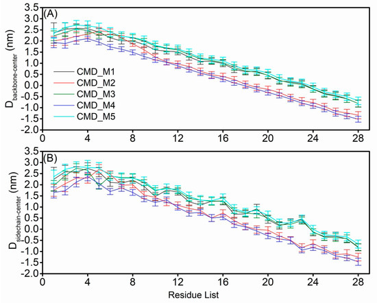 To compare the structural characteristics of the AapA1-28 protein in the two distinct conformational states, we calculated the position of each residue in the five sets of CMD_M simulations. The distance between the backbone or side chain of each residue and membrane center was calculated and is depicted in Figure 6. Firstly, the CMD_M2 simulation exhibited similar structural characteristics of transmembrane residues 9–28 as observed in the CMD_M4 simulation. Similarly, the CMD_M1 simulation displayed comparable structural features of transmembrane residues 9–28 with CMD_M3 and CMD_M5 simulations. The distance between K-23 NH3+ group and the closest phosphate group of membrane is shown in Figure S2B. There is a strong electrostatic interaction between the positively charged NH3+ of K-23 and the phosphate group of the membrane. Secondly, the primary difference between these two conformational states lies in the orientation of the K-23 side chain, whether it points towards the upper or lower membrane. The distance between K-23 NH3+ group and F-19 aromatic ring is shown in Figure S2A. When the sidechain of K-23 residue points to the upper membrane, there is not only electrostatic interaction between K-23 and phosphate group of the membrane, but also cation–π interaction between K-23 and F-19.
