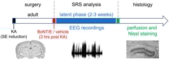 Experimental approach to investigating the antiepileptogenic effects of BoNT/E. In a second study, we administered BoNT/E 3 h after intrahippocampal KA. In this experimental paradigm, BoNT/E showed antiepileptogenic and neuroprotective effects [56]. Abbreviations: KA: kainic acid; SE: status epilepticus; SRS: spontaneous recurrent seizures.