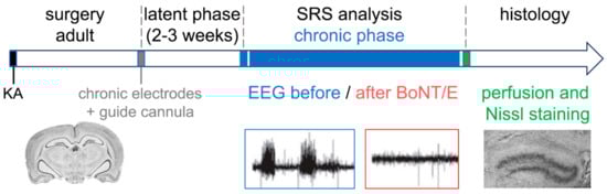 Epilepsy is a neurological condition largely diffused in the human population, characterized by the occurrence of spontaneous recurrent seizures responsible for hippocampal neuronal loss, reduced cognitive functions, and psychiatric comorbidities [38]. It presents as an exceptionally multifaceted cluster of diseases that vary in etiology, age of onset, type of seizure, and neurological and neuropathological manifestations. However, human genetic studies yielded a steady trickle of discoveries, thanks to which the critical role of ion channels in epilepsy has been postulated [39]. According to this idea, changes in ion channel functionality cause massive depolarization of neurons leading to excessive glutamate release responsible for seizure generation and brain damage [40,41]. Thus, drugs able to affect abnormal glutamate release by interfering with neurotransmitter release machinery may produce anti-ictal and neuroprotective effects. Starting from this concept, we investigated BoNT/E effects in the epilepsy context. Regarding this issue, we exploited a model of acute electroencephalographic (EEG) seizures triggered by intrahippocampal injection of kainic acid (KA; Figure 1) [42,43]. Administration of KA in rodents is widely used to model human temporal lobe epilepsy (TLE), a common form of epilepsy characterized by recurrent seizures originating in the temporal lobe (typically in the hippocampus) and often accompanied by hippocampal neurodegeneration [44]. The effects depend on the species (rat vs. mouse) and route of administration (intrahippocampal vs. systemic). In our studies, we used different KA models of TLE, which will be described in the following paragraphs.
