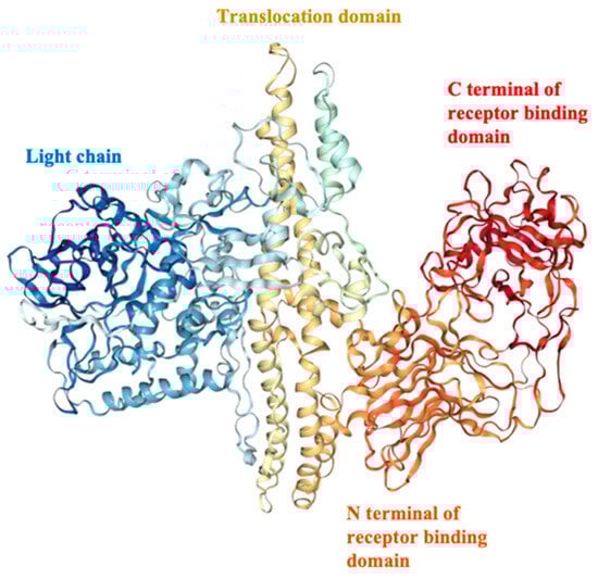 - Lacy, D.B.; Tepp, W.; Cohen, A.C.; DasGupta, B.R.; Stevens, R.C. Crystal structure of botulinum neurotoxin type A and implications for toxicity. Nat. Struct. Biol. 1998, 5, 898–902. [Google Scholar] [CrossRef]