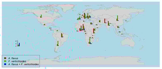 A world map showing the number of studies that surveyed the (co-)occurrence of A. flavus and F. verticillioides. The number of studies is represented as a bar chart for A. flavus (red color), F. verticillioides (green color), and both fungi (blue color).