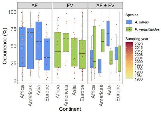 Boxplots show the percentage of contaminated maize samples with A. flavus, F. verticillioides, and both fungi in survey studies from Africa, the Americas, Asia, and Europe. The data points are colored according to the year of sampling.