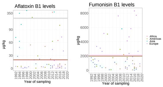 A general overview of the number of studies per country reporting the (co-)occurrence of A. flavus and F. verticillioides in different continents between 1980 and 2020 is shown in Figure 1. Furthermore, their sampling years, sample numbers, and the percentage of occurrence are shown in Table 1. Most of these studies were on A. flavus occurrence, followed by F. verticillioides, while fewer studies on the co-infection were published. The research of A. flavus was highest in Africa, with 74 scientific papers, followed by Asia (39 studies), Europe (35 studies), and the Americas (14 studies). However, Europe has a high awareness of studying the contamination of F. verticillioides that was reported in 51 papers, followed by Africa (40 studies), Asia (37 studies), and the Americas (27 studies). These data show that people are paying more attention to the contamination of both fungi [], which reflect that the mycotoxin pollution problem of these two is increasing during these years. Figure 1 shows that more research of A. flavus and F. verticillioides is related to hot and rainy climates in African countries, which favored the growth of the two fungi. Apart from Africa, it was noticeable that southern European countries (Italy, Portugal, Spain, and Romania), some Asian countries (China, India, Iran, and Pakistan), and other countries in Latin and northern Americas (Brazil, Argentina, and United States) had a considerable number of publications. Gradually, those areas face an increased risk of A. flavus and F. verticillioides co-contamination []. In total, there are 30 papers in the literature reporting the co-occurrence of A. flavus and F. verticillioides in maize from all continents: Africa (12 studies); Europe (8 studies); Asia (6 studies); and the Americas (4 studies). It is noticeable that all these previous surveys were conducted in countries with hot climates. However, there is an increasing number of studies in European cold climate countries due to global warming. Global warming is no longer a trend but a reality because many countries have excessive emissions of CO2 []. To mitigate the threat of climate change, 195 countries agreed to limit the emission of CO2 by adopting new rules []. The co-occurrence of A. flavus and F. verticillioides will likely increase worldwide, especially in Europe.