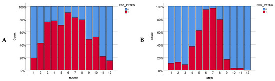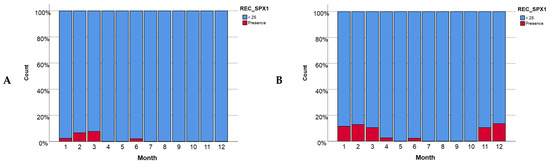 The presence of SPX-1 per month (A) in Alfacs Bay and (B) in Fangar Bay.