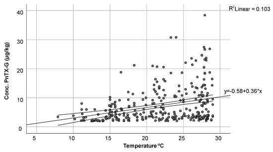 For PnTX-G, a more in-depth study regarding its concentrations and temperatures was carried out. Figure 4 represents how the concentration of PnTX-G (µg/kg) varies with temperature, with a linear relationship observed between both variables. As the water temperature increased, so did the concentration of this toxin, reaching high values of 3.65 µg/kg at 20 °C until reaching maximum concentration values of 38.43 µg/kg around 28 °C. The minimum concentration was determined to be 2 µg/kg at 12.5 °C.