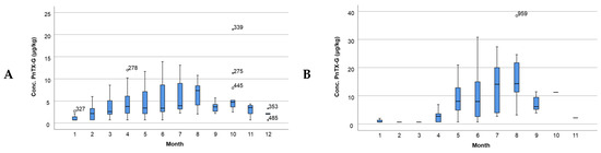 Representation of the PnTX-G concentration by month (A) in Alfacs Bay and (B) in Fangar Bay. Note: dots and asterisks denote outlier observations.