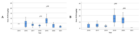 Representation of the PnTX-G concentration per year (A) in Alfacs Bay and (B) in Fangar Bay. Note: dots and asterisks denote outlier observations.