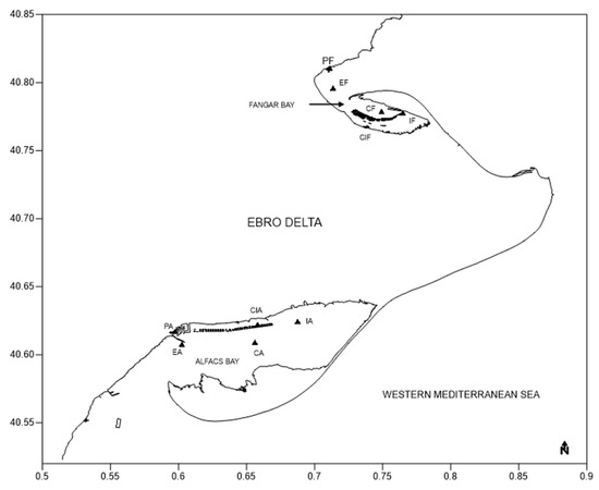 Catalonia (Spain) ranks second in Spain in terms of the most robust mussel aquaculture. In 2022, 2905.2 tons of mussels, 397.31 tons of oysters, and 6.3 tons of clams were produced (IDESCAT, Aquaculture Production by Species from the Ministry of Climate Action, Food, and Rural Agenda of Catalonia, 2022). Notably, 90% of northwestern (NW) Mediterranean farm areas are situated in Alfacs Bay and Fangar Bay within the Ebro Delta. Both bays have shallow depths, freshwater inputs, and relatively calm waters, and provide shelter from coastal circulation. Fangar Bay (12 km2) is located in the northern part of the Ebro Delta, with a maximum depth of approximately 4 m. Alfacs Bay is larger than Fangar Bay; it is located in the southern part of the Ebro River Delta, and it has a surface area of 49 km2 and a maximum depth of about 6 m. The water renewal time is 20–70 days for Alfacs Bay [1] and 2–5 days for Fangar Bay [2].