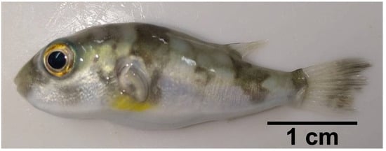 Chelonodontops patoca (formerly known as Chelonodon patoca) is a euryhaline marine pufferfish inhabiting coastal waters, including reef-associated areas and tropical waters [38]. These pufferfish, which inhabit the subtropical waters of Japan, such as the coastal waters of Okinawa Prefecture and Amami-Oshima Island, Kagoshima Prefecture, possess large amounts of TTXs in their skin and ovary, but there have been no reports of STXs being detected [39,40]. On the other hand, in addition to TTXs, STXs equivalent to approximately 16% of the total toxin have been detected in individuals collected in tropical waters off the coast of the Philippines [27]. Therefore, C. patoca, like pufferfish of the genera Arothron and Canthigaster, are thought to be capable of possessing TTXs and STXs simultaneously, although they have a greater preference for TTXs. In this study, to test our hypothesis mentioned above that the ratio of TTXs/STXs in a pufferfish is dependent on its inherent TTXs/STXs selectivity, we conducted an intrarectal TTX/STX administration experiment using nontoxic cultured individuals of a species that possesses TTXs and STXs simultaneously, namely C. patoca (Figure 1).