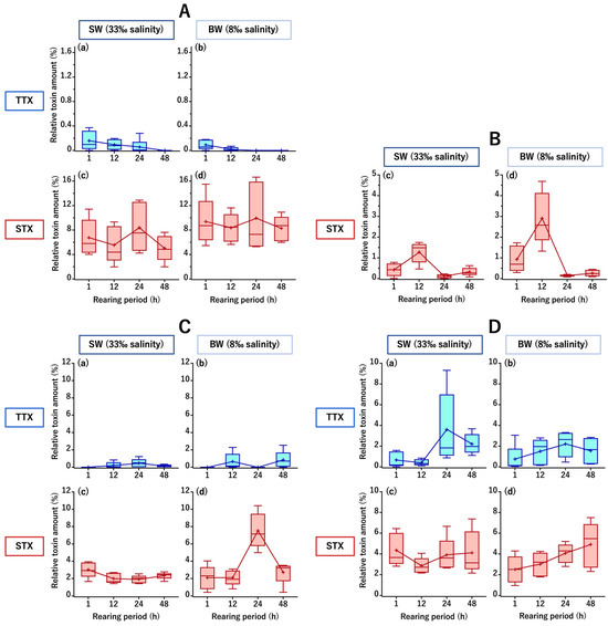 Changes in the relative amounts of tetrodotoxin (TTX) (a,b) and saxitoxin (STX) (c,d) (percentage of the administered dose) in the intestine (A), liver (B), muscle (C), and skin (D) of C. patoca at 1, 12, 24, and 48 h after intrarectal administration of TTX/STX. (a,c) Represent the seawater group (SW, acclimated/reared at 33‰ salinity) and (b,d), the brackish water group (BW, acclimated/reared at 8‰ salinity). Data are shown as means (plus signs), medians (inner horizontal lines), upper extremes (bars above), and lower extremes (bars below).