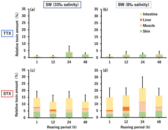 Relative amounts of TTX (a,b) and STX (c,d) accumulated in the whole body (intestine, liver, muscle, and skin) of C. patoca at 1, 12, 24, and 48 h after intrarectal administration of TTX/STX. (a,c) Represent the SW group and (b,d) represent the BW group. Data are shown as means (columns) and standard deviations (SDs) (error bars).