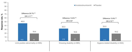 In patients with limb position abnormality at baseline, incobotulinumtoxinA treatment produced a higher response rate than placebo (46.0% vs. 19.4%, a difference (95% confidence interval (CI)) of 26.7 (20.2–33.1)%; p < 0.0001), with incobotulinumtoxinA-treated patients being at least three times more likely to achieve a response than placebo-treated patients after the first cycle (odds ratio (OR) 3.11, 95% CI 2.04–4.75; p < 0.0001) (Figure 1 and Figure S1). IncobotulinumtoxinA treatment also produced a higher response rate than placebo after the first cycle for patients with baseline dressing disability (32.2% vs. 18.6%, a difference (95% CI) of 13.6 (7.3–19.9)%; p < 0.0001) and hygiene-related disability (33% vs. 19.2%, a difference (95% CI) of 13.8 (7.3–20.3)%; p < 0.0001) (Figure 1). Additionally, incobotulinumtoxinA-treated patients were at least twice as likely to achieve a response as placebo-treated patients regarding baseline dressing disability (OR 2.03, 95% CI 1.32–3.12; p < 0.01) and hygiene-related disability (OR 2.73, 95% CI 1.77–4.21; p < 0.0001) after the first cycle (Figure 1).