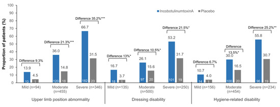 Results showed that a significantly greater proportion of incobotulinumtoxinA-treated compared with placebo-treated patients achieved a ≥1-point improvement in limb position abnormality, dressing- and hygiene-related disability DAS scores 4 weeks after the first injection. Compared with patients receiving a placebo, incobotulinumtoxinA-treated patients were at least three times more likely to achieve a reduction in DAS limb position abnormality score, almost three times more likely to achieve a reduction in DAS hygiene-related disability score, and at least twice as likely to achieve a reduction in DAS dressing disability score. Importantly, the benefits of incobotulinumtoxinA were observed regardless of the baseline severity of DAS impairment and, in those with stroke-related spasticity, of the time elapsed since stroke, although differences versus placebo were not always statistically significant in the subgroups. Specifically, patients with mild upper limb position abnormality or hygiene-related disability did not have statistically significantly higher response rates with incobotulinumtoxinA than with placebo. These nonsignificant findings may have been a result of the smaller numbers of patients with mild disability, the likelihood that individuals with mild disability have residual control of voluntary movements, which allows improvements in task performance in the placebo groups, or the fact that the opportunity for large improvements in those with only mild disability is reduced. Nonsignificant differences from placebo seen in time-since-stroke subgroups generally occurred with no discernible pattern, and again, patient numbers were reduced as time since stroke increased.