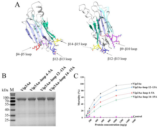 Vip3Aa contains five domains and domain III, composed of three antiparallel β–sheets, plays an important role in the interactions between Vip3Aa and the receptors in S. frugiperda BBMVs [8,10]. Four special loops (β4–β5 loop, β9–β10 loop, β12–β13 loop, and β14–β15 loop) in domain III were selected and mutated in this study to further elucidate the insecticidal mechanism of Vip3Aa (Figure 1A). The β4–β5 loop (D365SI367), β9–β10 loop (K429KMKTL434), and β14–β15 loop (E498NSR501) are from different β–sheets in domain III and are protruding loops. The β12–β13 loop (S468ANDDG473) is the least conserved loop in Vip3 protein domain III (Figure S1). Moreover, these four loops are exposed to the surface of the Vip3Aa protein (Figure S2). Four loop mutants (Vip3Aa–loop4–5A, Vip3Aa–loop9–10A, Vip3Aa–loop12–13A, and Vip3Aa–loop14–15A) were constructed by replacing all residues in each specific loop with alanine.